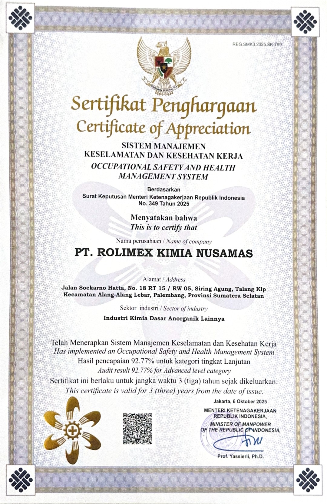 We continually work towards improvements and an effective system with ISO 9001, ISO 45001, ISO 14001, SNI, HAS 23000 (Halal), SMK3 (Gold), and PROPER (Blue).